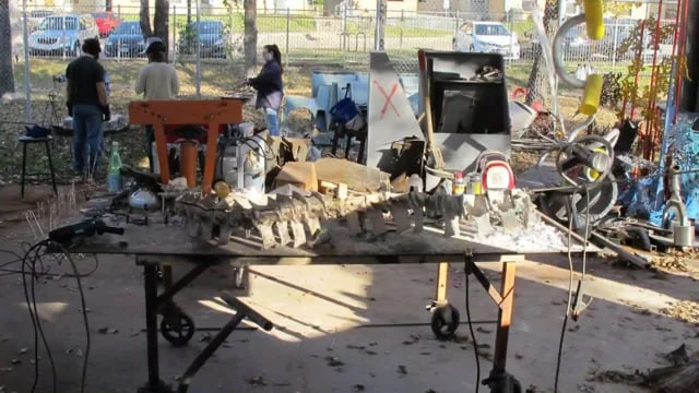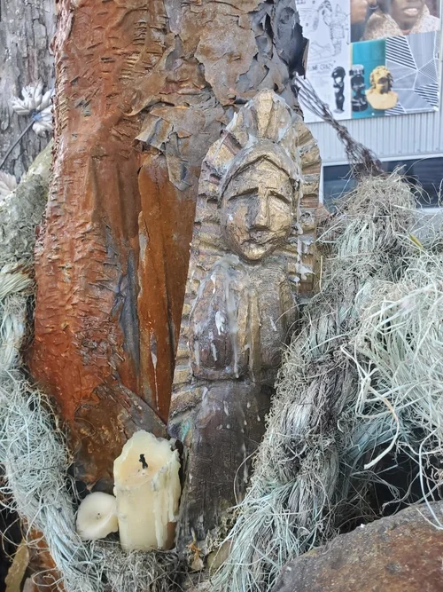 Materials include steel, recycled styrofoam, found ship rope, grass, vines, oyster shells, charcoal, and papermache. Dimensions: 20’ x 6’ x 12’